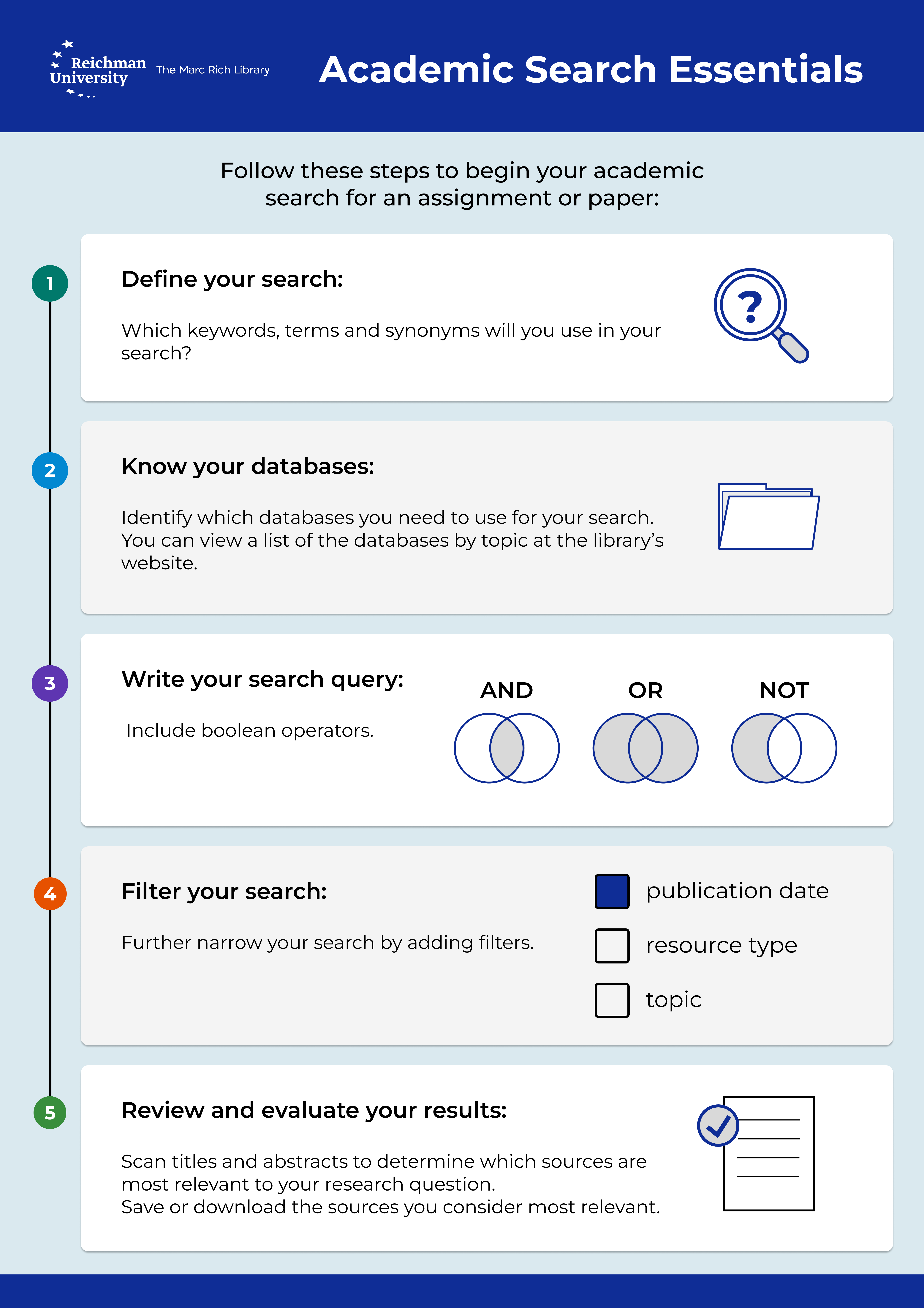 – Apply advanced search strategies such as Boolean operators, filters, and keywords to refine database searches and retrieve relevant results.
