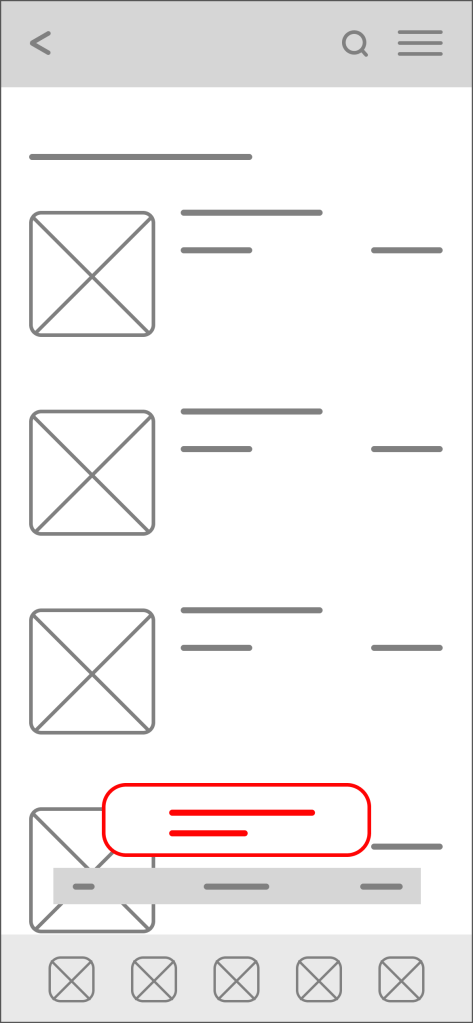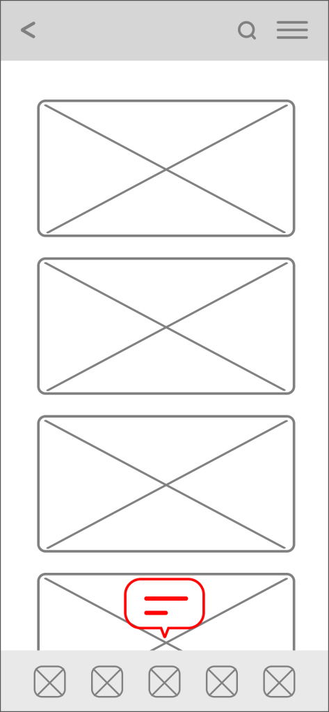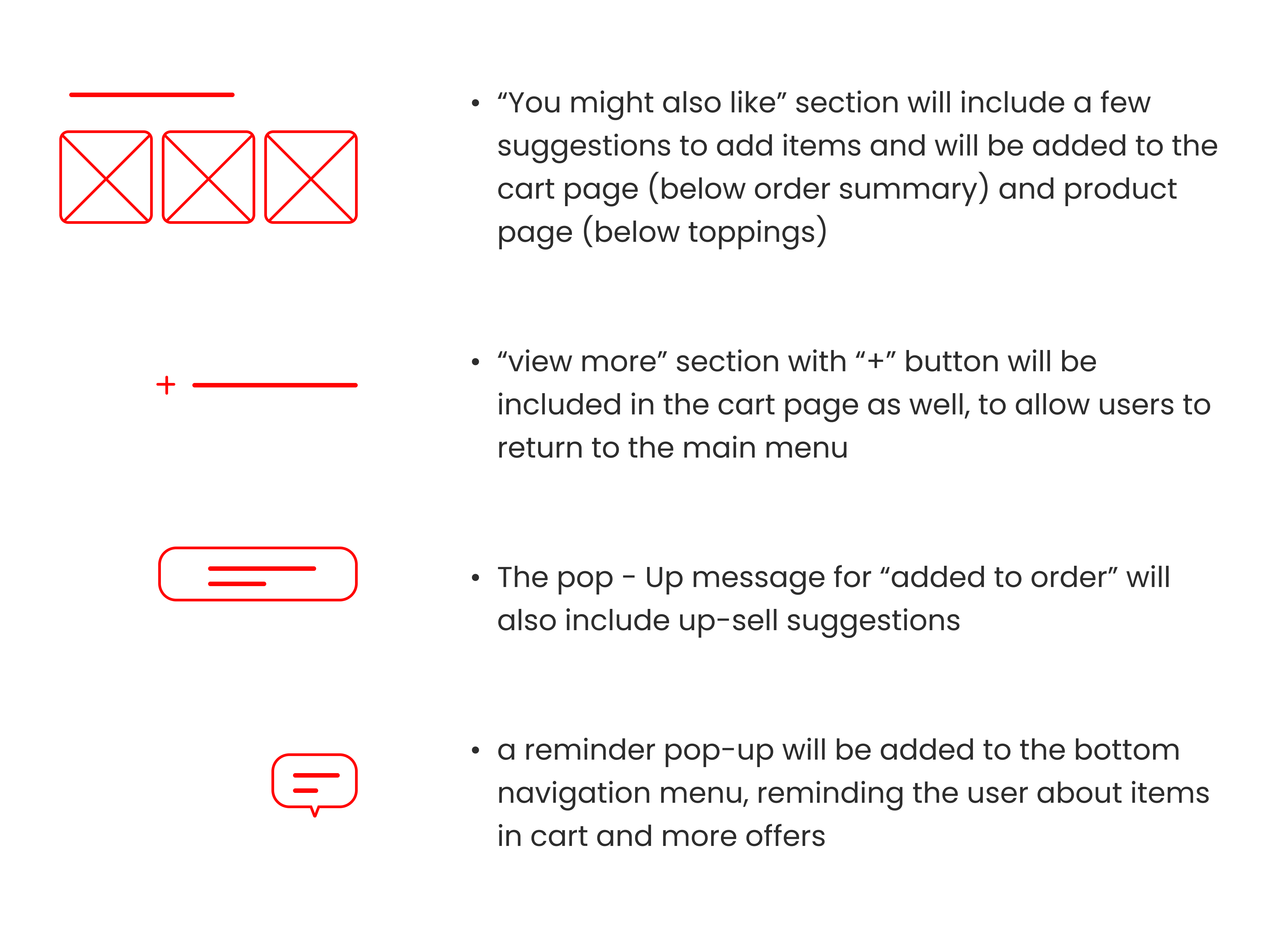 I created the low fidelity wireframes by replicating the existing UI of the Gong Cha App, and adding the upsell methods (marked in red), to visualise the changes in layout and micro-interactions.